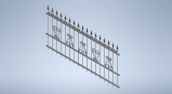 Das Zaunelement besteht aus senkrechten Stäben aus 12 mm Rundstahl, die oben mit Zierspitzen versehen sind. Die waagerechten Profile sind aus 40×20×2 mm Rechteckrohr gefertigt. Im oberen Bereich sind zwischen den Stäben Zier-C-Bögen eingeschweißt, im mittleren Bereich befinden sich fünf doppelte S-Elemente als Zierfüllung.