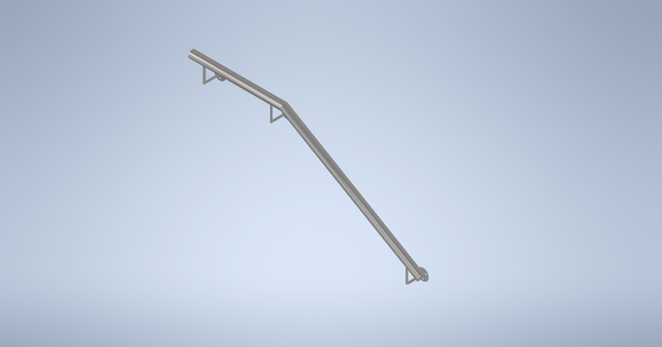 Wandhandlauf aus Ø 42 mm Edelstahlrohr, zweiteilig mit geradem oberen Ende und Knick, zur Wandmontage. Gesamtlänge 2 m, befestigt mit drei Wandhaltern aus Edelstahl.