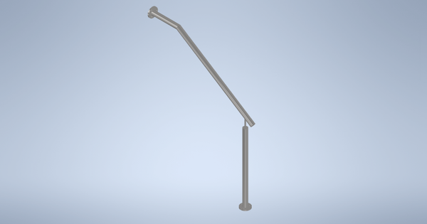 Handlauf aus Ø 42 mm Edelstahlrohr, zweiteilig mit Knick und geradem Ende, 2 m lang und 900 mm hoch. Oben an der Wand befestigt, unten mit senkrechter Stütze am Boden verschraubt.