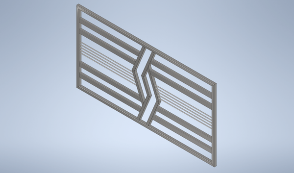Zaunfeld mit umlaufendem Rahmen aus Vierkantrohr 40x40x2,5 mm. In der Mitte ein mittig versetztes, symmetrisches Element aus 40x40x2,5 mm. Die horizontalen Füllstäbe im Innenbereich bestehen aus Rundrohr Ø13,5 mm. Darüber und darunter waagerechte Füllungen aus Rechteckrohr 60x20x2 mm.