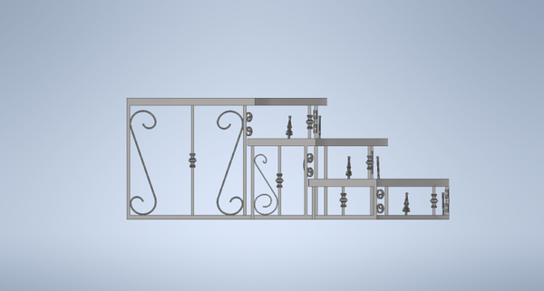 Stahltreppe mit drei Trittstufen aus rutschhemmendem Gitterrostbelag. Der Unterbau besteht aus dekorativen Schmiedeelementen. Die Stufenfront ist mit Zierstäben und Ornamenten ausgefüllt. Wird feuerverzinkt und mit Pulverbeschichtung in Wunschfarbe angeboten.