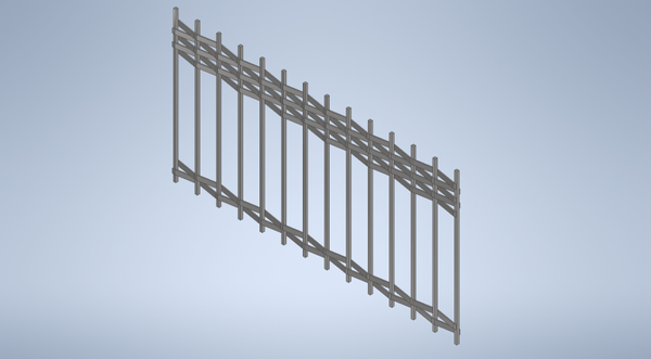 Zaunfeld mit senkrechten Stäben aus 12 mm Vierkantstahl. Um jede dieser Stangen ist ein durchgehender Flachstahl 40×5 mm in gleichmäßigem Abstand spiralförmig gewickelt. Die Flacheisen winden sich jeweils über mehrere Stäbe hinweg und sind an den Kreuzungspunkten mit den senkrechten Stangen fest verschweißt