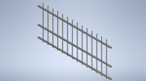Die senkrechten Stäbe bestehen aus 14 mm Sechskantstahl mit verrundeter Spitze. Drei waagerechte Profile aus gehämmertem 40 × 30 × 2,5 mm Kastenprofil verlaufen horizontal. Die Stäbe sind jeweils von unten an das Profil angeschweißt.