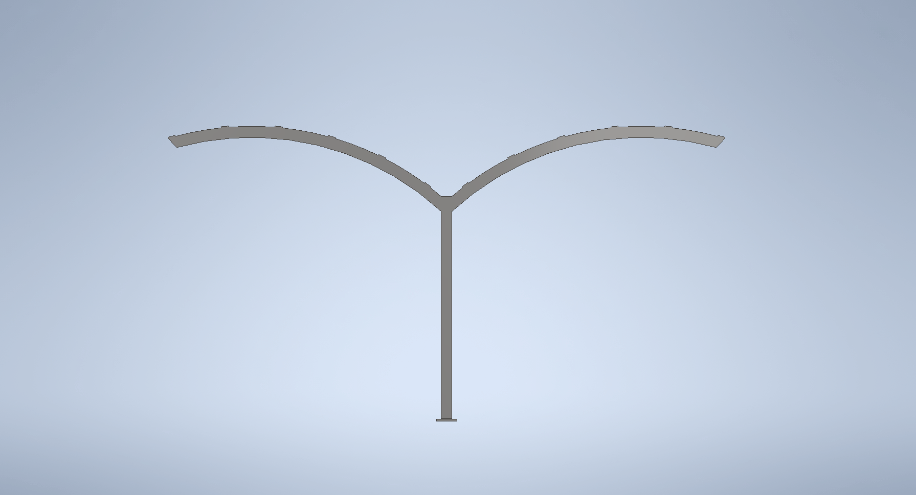 Carport mit geschwungener Dachkonstruktion. Die gebogenen Dachträger bestehen aus 80×80×3 mm Vierkantrohr, die senkrechten Pfosten aus 120×80×4 mm Rechteckrohr. Zwischen den Trägern ist ein U 140-Profil als zentrale Dachrinne integriert. Die gesamte Konstruktion ist verschraubt. Maße ca. 5000mm breit und 4000 mm tief bei einer Höhe von ca. 2800 mm.
