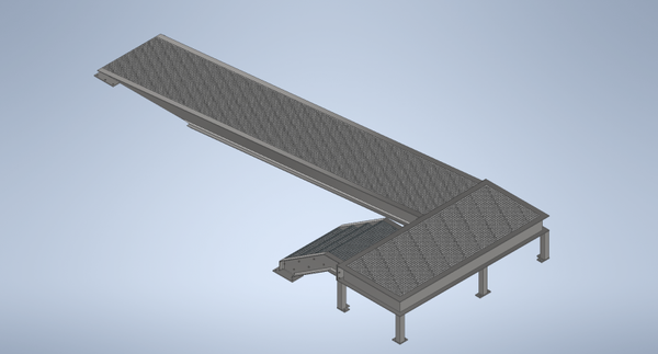 Stahlrampe mit angeschlossener Treppe und Podest. Die gesamte Konstruktion besteht aus U 240-Profilen. Innenliegend ist ein Flacheisen 50×12 mm eingesetzt, auf dem Gitterroste mit einer Höhe von 30 mm verschraubt sind.