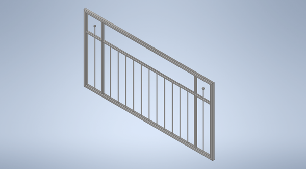 Zaunfeld mit Rahmen aus 40×40×2,5 mm Vierkantrohr. Zwei senkrechte Elemente am Rand sowie ein waagerechtes Element in der oberen Feldhälfte sind aus 40x30x2 ausgeführt. Die übrigen senkrechten Stäbe bestehen aus Ø 12 mm Rundstahl. Zwei der Rundstäbe stehen einzeln und sind jeweils mit einer Zierkugel versehen.